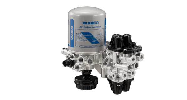 • Air dryer equipped with two solenoids and combined with multiple circuit protection valve